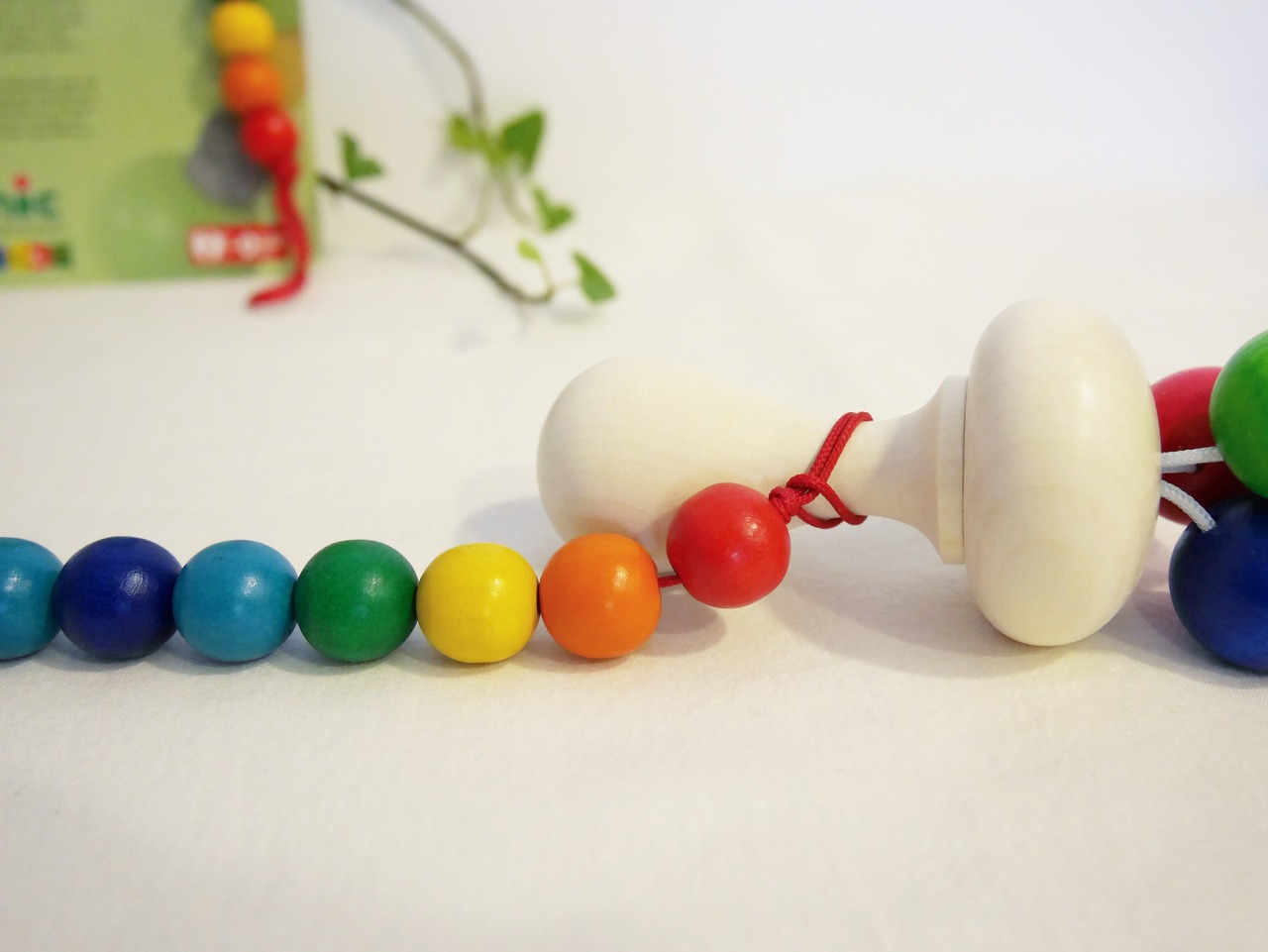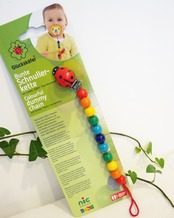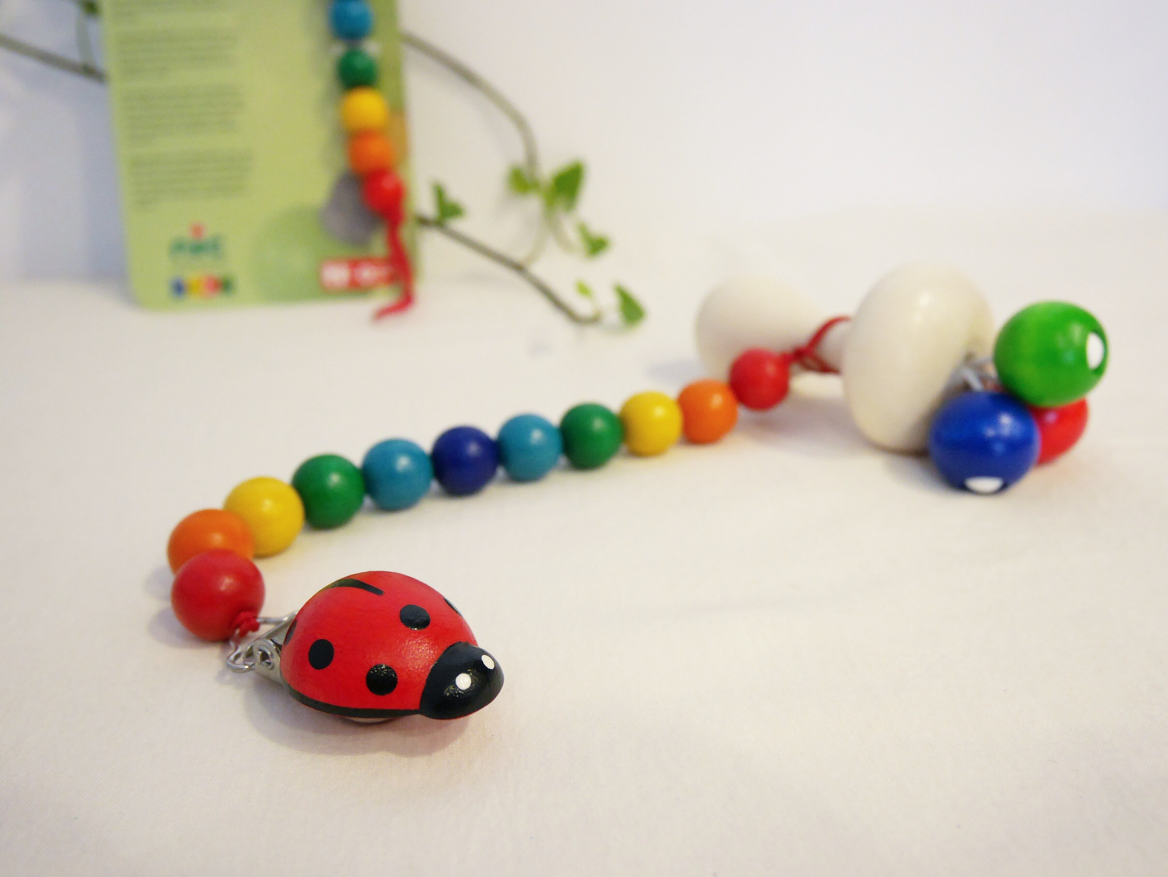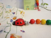 紐の先におしゃぶりやおもちゃを失くさないよう結んでから、てんとう虫のクリップでベビーカーや洋服に固定します。