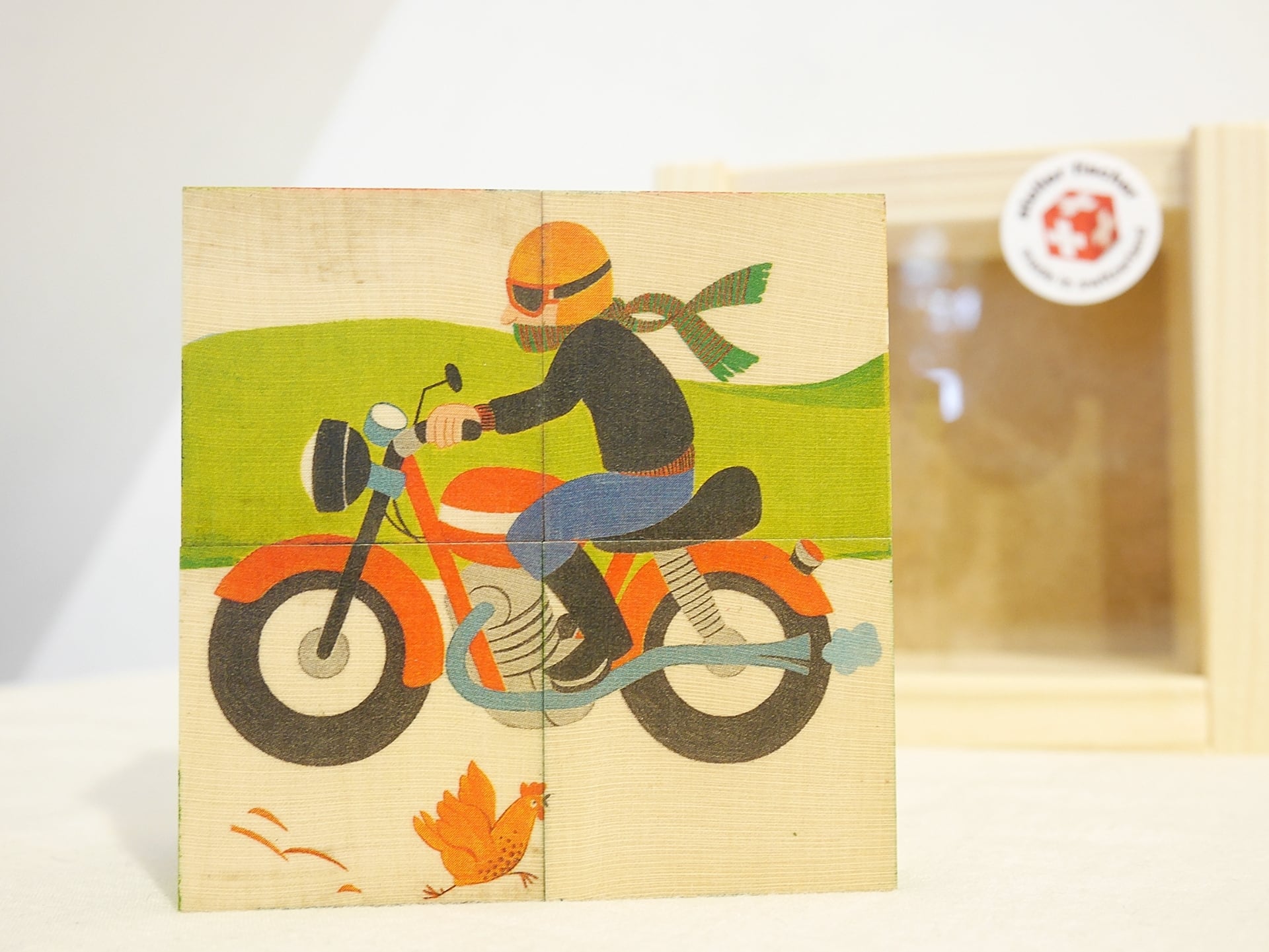 フィッシャー 家が創り出すパズルは個性豊か、特に絵柄には独自のスタイルを感じさせます。『自分の足で森を歩いて気に入った木をみつけ、直接森林管理者から買う』 フィッシャーさんはこれらのパズルのことを『木と子どもの対話こそがこのパズルの大きな役割』とおっしゃいます。『手に触れた時の感触 、温かみ、木と木の触れ合う音…五感で受け止め、木と語った時間は、 忘れがたい経験として子どもの心と身体に残されるに違いない』とフィッシャーズさんのパズルから、すべての人への愛情が感じられます。
