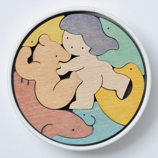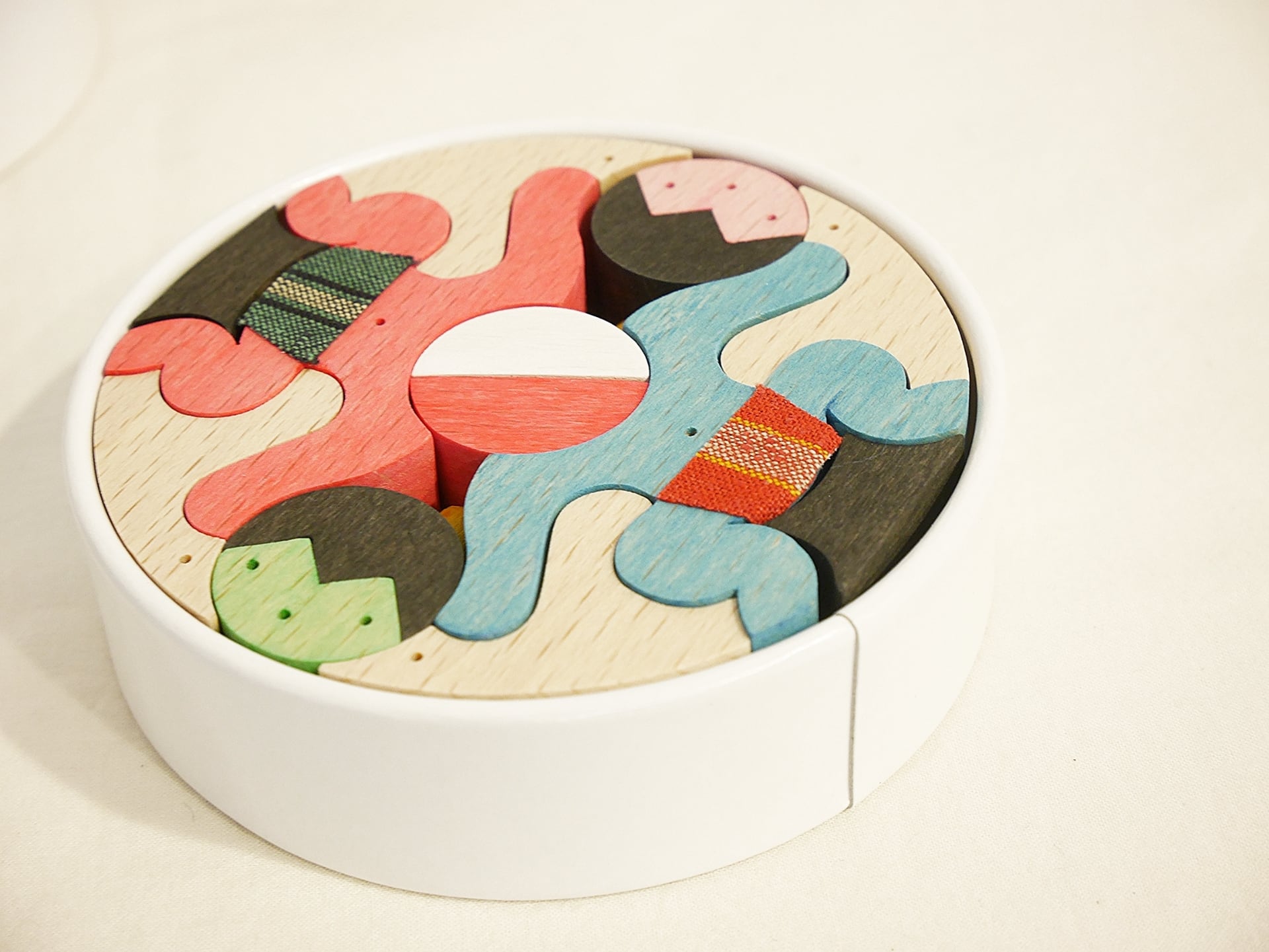 円形紙容器に木片が収まる段飾りの絵武者人形です。1段目はかぶと童子と鯉とかがり火、2段目は赤鬼青鬼、3段目は桃太郎坊やと一対の鯉のぼり、鳥、銀杏の葉の扇、4段目は金太郎とクマと小動物、5段目は富士のり兜童子と一対の鯉のぼり。