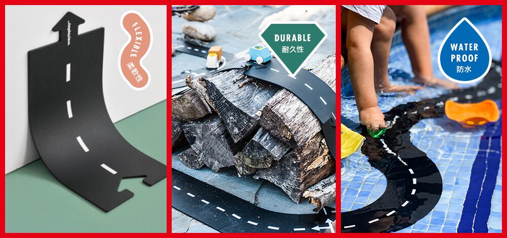 柔軟性があることで、カーペット、テーブル、ガラス、石、砂場やビーチ、雪の上などおおよそどこでも設定を可能にし、更に高い耐久性でロングライフをも可能にしました。また、防水で洗浄も容易にできることでお風呂や砂場などでのPLAYを実現しました。