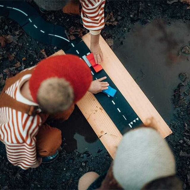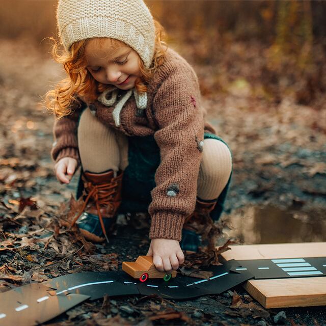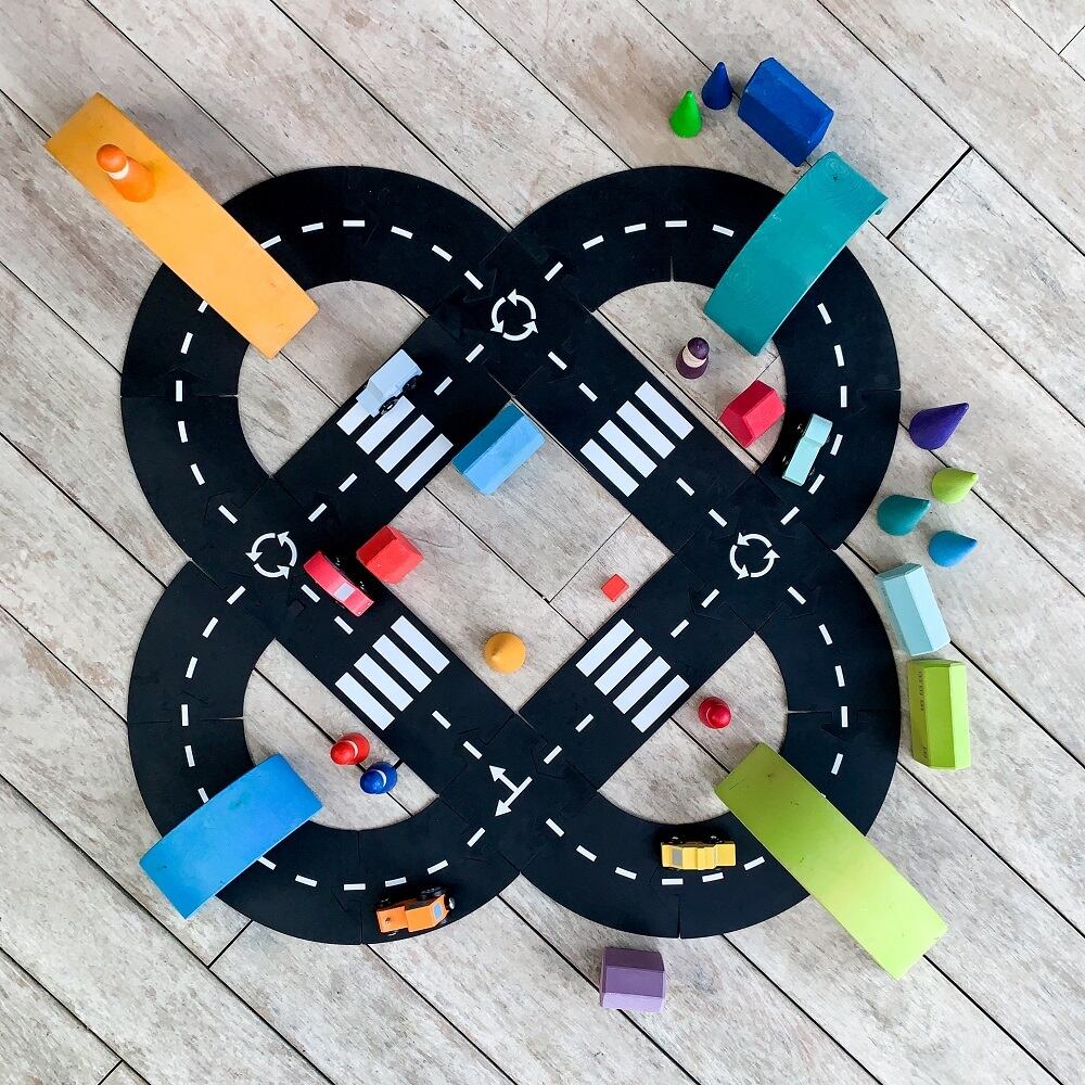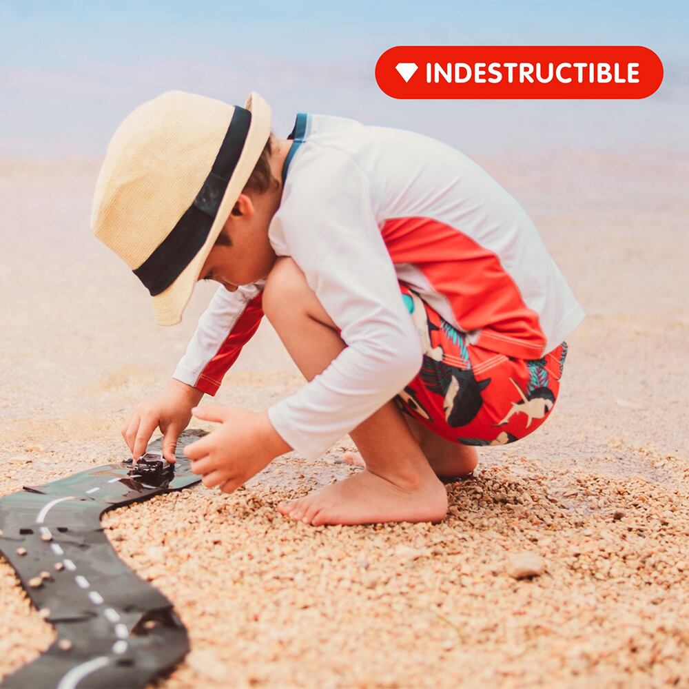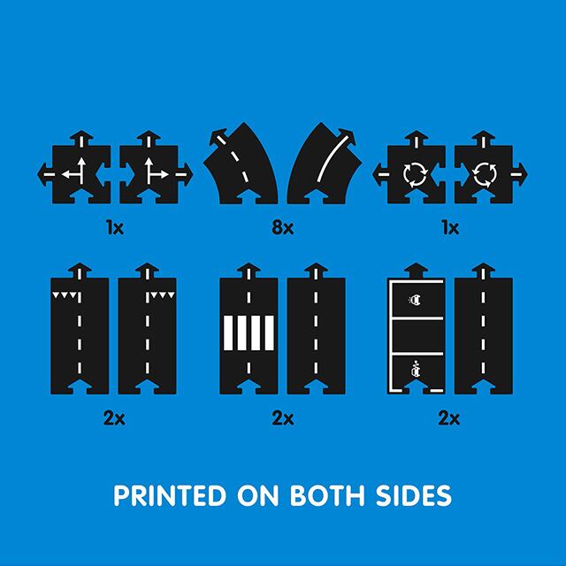 柔軟で耐久性のある全長258cm の道路のおもちゃは、8枚のカーブ、6枚の直線、1枚の交差点、1枚の環状交差点を含みます。おうちの中でも外でも使用でき、想像力豊かな遊びを奨励します。既にお持ちの他のおもちゃと組み合わせるのに最適で、ヨーロッパ、米国、日本、中国で最高の玩具テスト規範※に準拠しています。